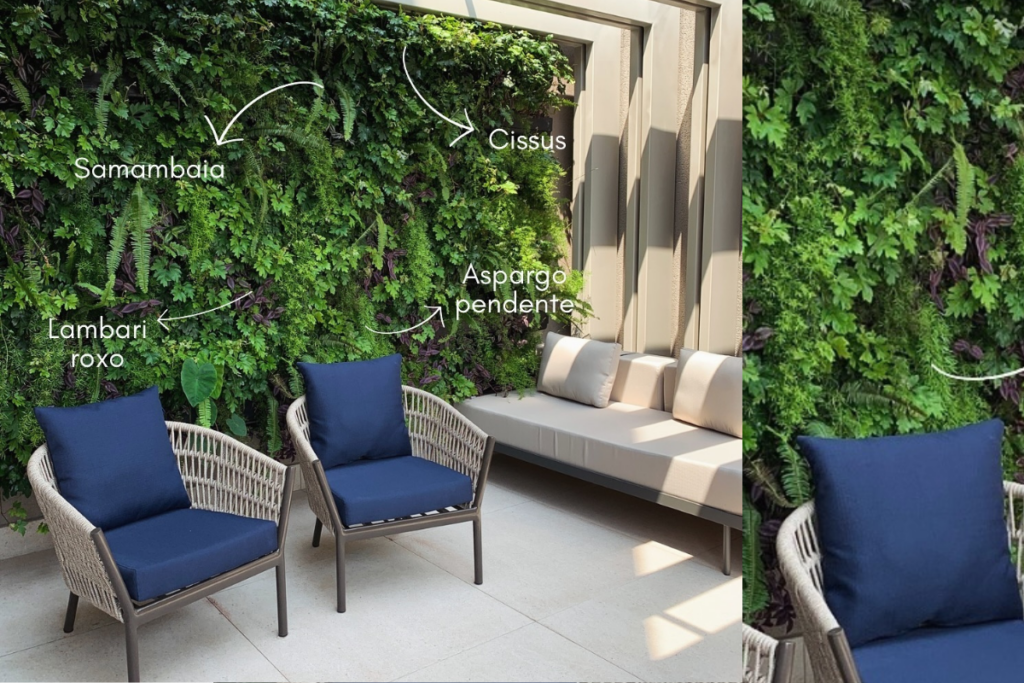 Este jardim vertical combina elegância e frescor com praticidade. Plantas como samambaia, cissus e lambari-roxo criam textura e contraste. Além disso, o aspargo-pendente reforça a leveza, tornando o ambiente mais acolhedor, natural e ideal para relaxar ao ar livre.