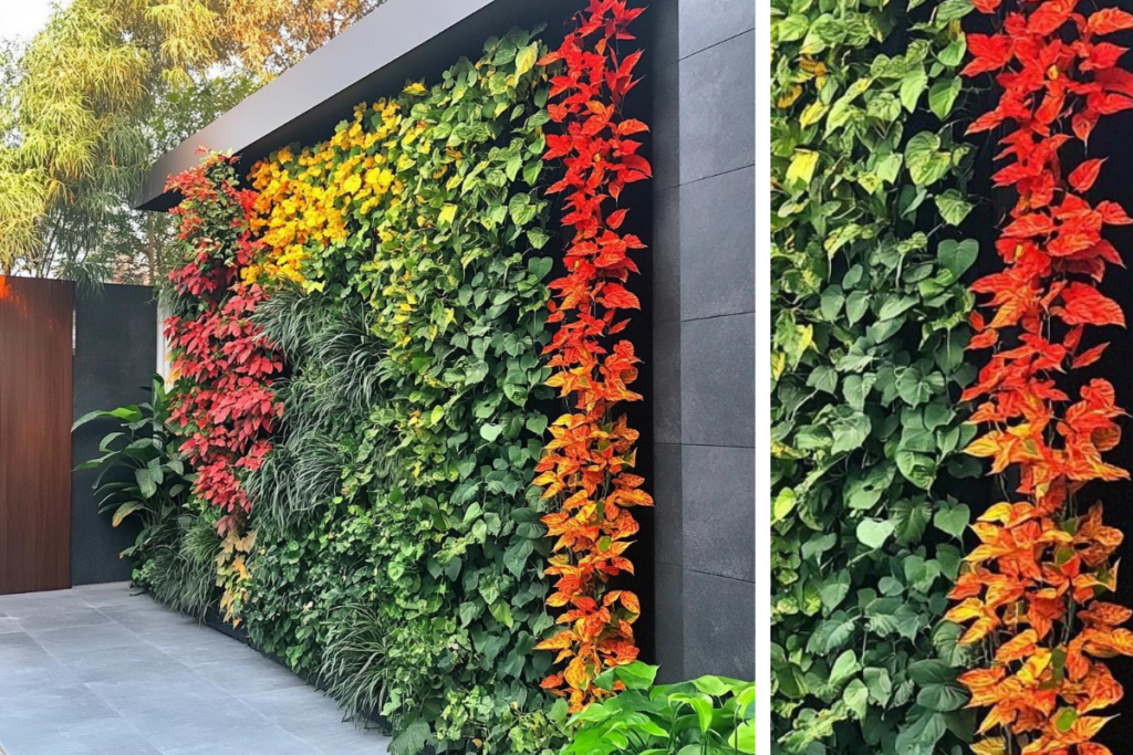Este jardim vertical se destaca pela composição vibrante e bem planejada. As folhagens coloridas formam um degradê natural que vai do amarelo ao vermelho, criando um efeito visual dinâmico. Além disso, o contraste com o revestimento escuro valoriza ainda mais as cores.