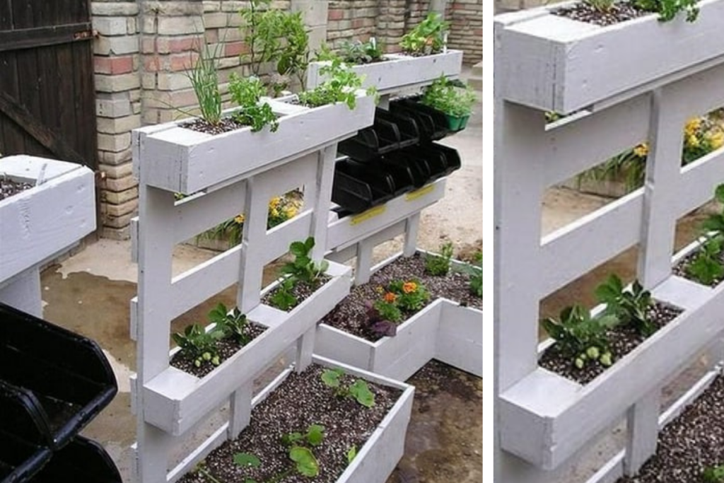 Com o uso criativo de pallets reaproveitados e pintados de branco, esta mini horta vertical alia funcionalidade e charme. Além de oferecer espaço em diferentes níveis para o cultivo de hortaliças e flores, ela promove organização e sustentabilidade. Dessa forma, transforma qualquer cantinho em um ambiente mais verde, bonito e prático.