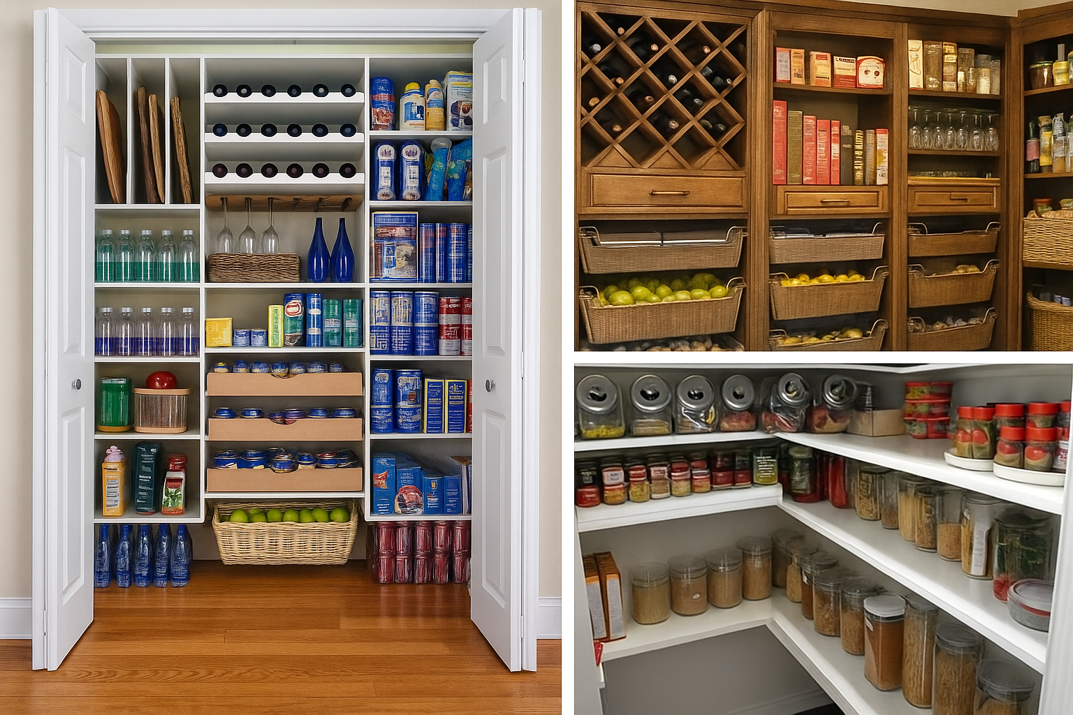 Essa imagem reúne três ideias criativas para despensas organizadas. À esquerda, prateleiras deslizantes com iluminação tornam tudo acessível. No canto superior direito, compartimentos personalizados otimizam cada item. Já abaixo, o vidro revela organização funcional. Assim, cada modelo inspira praticidade e estilo.