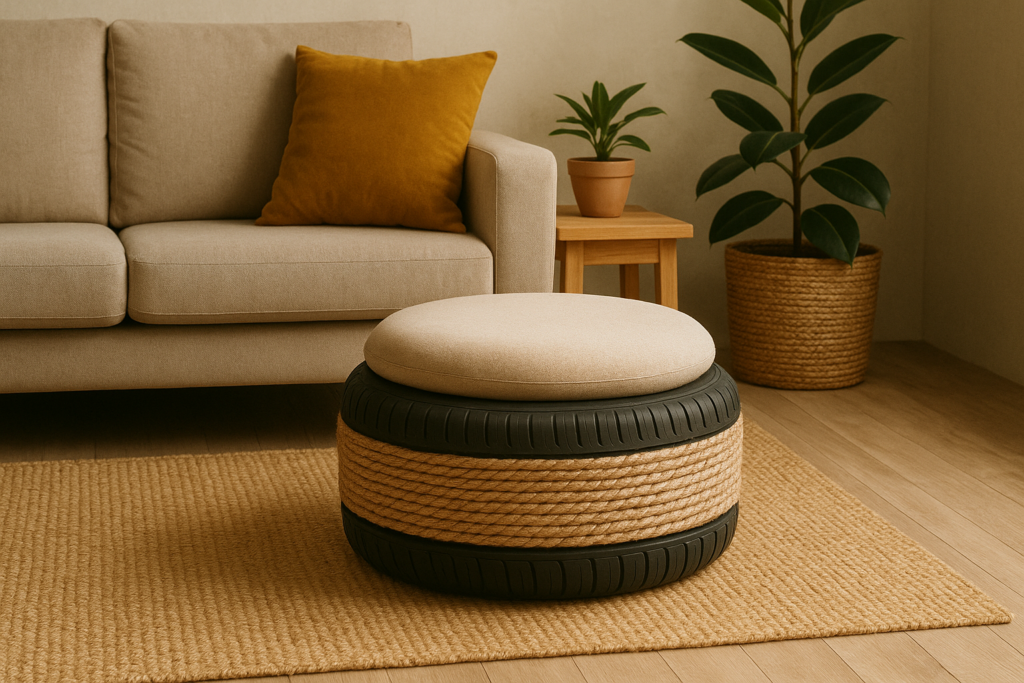 Embora pareça inusitado, pneus usados podem virar puffs incríveis. Com corda de sisal, tecido e uma base firme, você cria um assento rústico e moderno. Assim, além de decorar, você contribui com o meio ambiente ao reutilizar materiais.