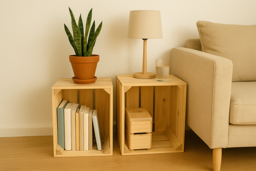 Os caixotes de madeira, muitas vezes descartados, podem se transformar em nichos, estantes ou até mesinhas de apoio. Com lixa, tinta e criatividade, eles ganham uma nova função. Por isso, reutilizar é uma ótima forma de economizar e personalizar.